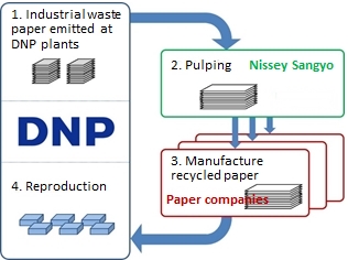 Dai Nippon Printing Co., Ltd. (DNP) has created a resources recycling system to allow for the reuse of paper, such as margins and surplus portions generated during the manufacturing process to be reproduced as products in DNP Group factories.