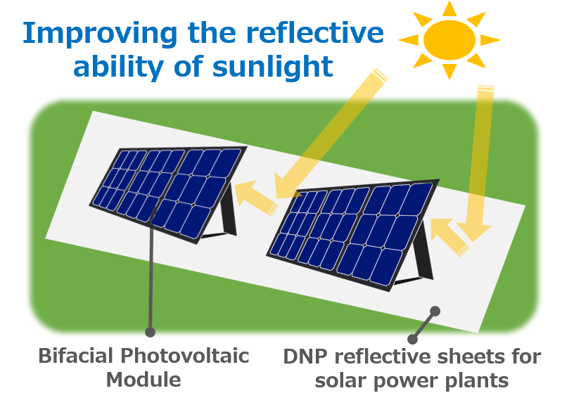 In response to these needs, DNP has commenced supply of “DNP reflective sheets for solar power plants”, leveraging its track record of providing back sheets and encapsulants for solar cell modules with high durability and reliability. The sheet improves the power generation output of bifacial photovoltaic modules, and has been developed based on converting technology that combines a variety of materials and reliability assessment technology.