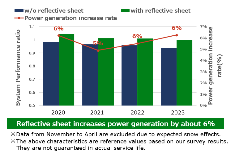 DNP have been conducting demonstration tests at a solar power plant in Asahikawa City, Hokkaido since 2020, and have confirmed that the effect of the sheet boosts power generation by approximately 6%. We have also confirmed that the system maintains performance even three years following installation.