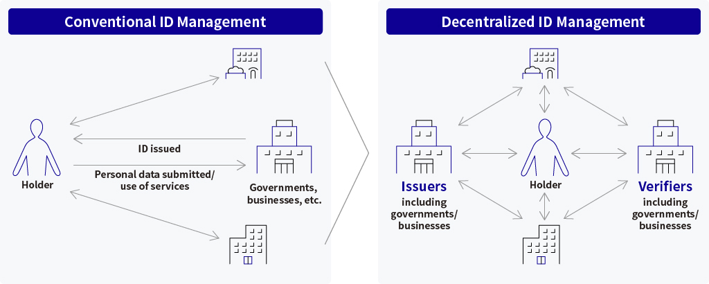 Decentralized ID is a system that allows individuals to control information about their identity and securely share it with others as needed by utilizing digital credentials (Verifiable Credentials※1) and a digital identity wallet that manages these.