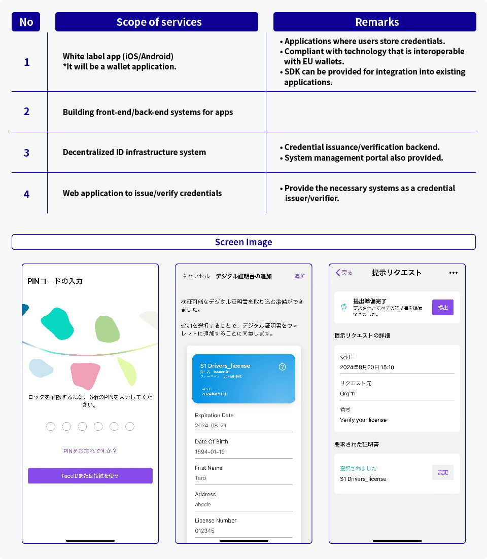 We provide all the necessary functions for decentralized ID business in a one-stop solution, including digital identity wallet applications and the foundational systems for issuing and verifying VCs. This allows you to quickly embark on your decentralized ID business.
