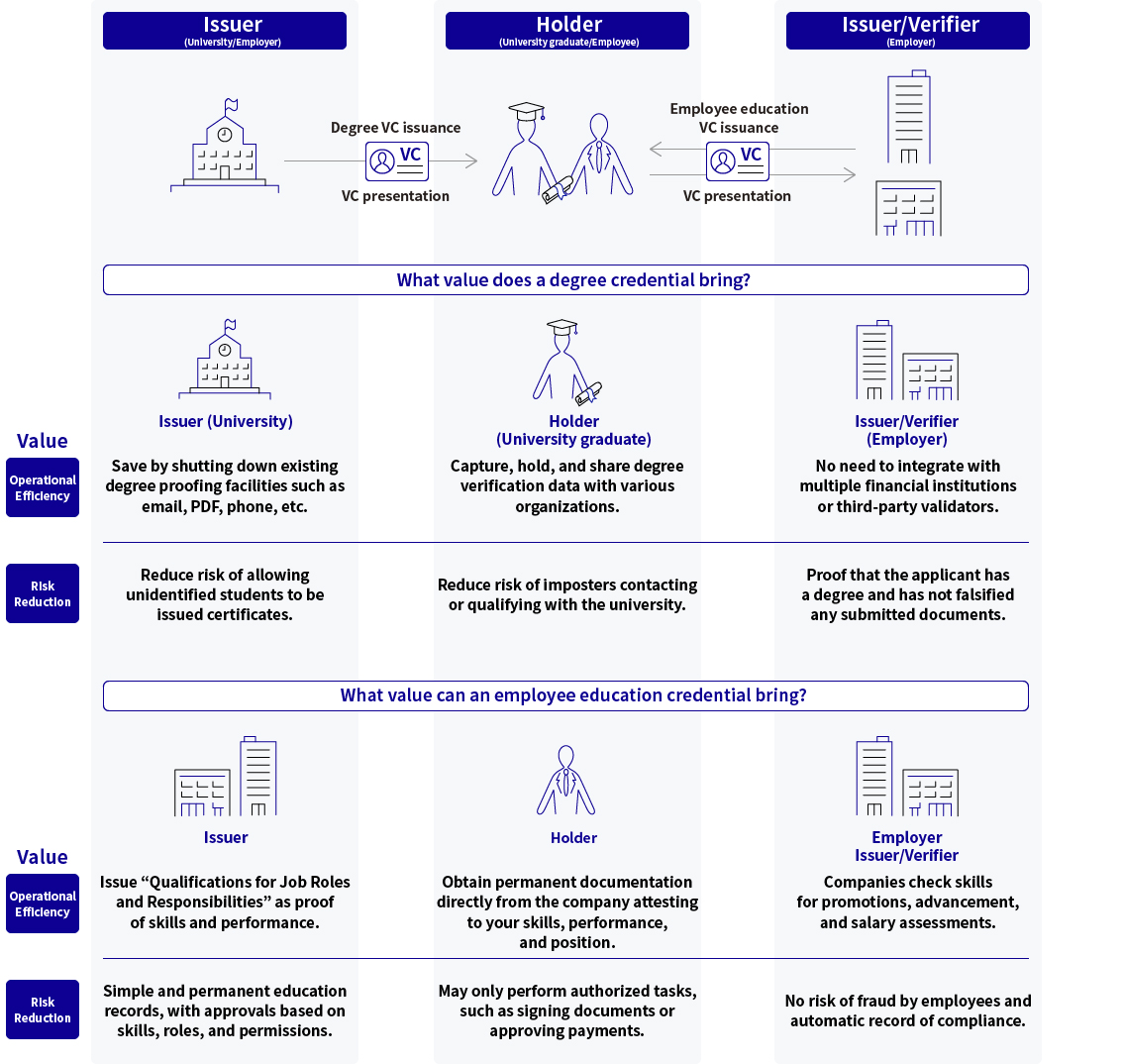 By converting degrees into VCs, universities and companies can automate the entire flow of degree issuance and verification online. Companies can also convert educational records and work experience into VCs for their employees, which help understand their skills and reducing the risk of unqualified employees taking on specialized tasks.