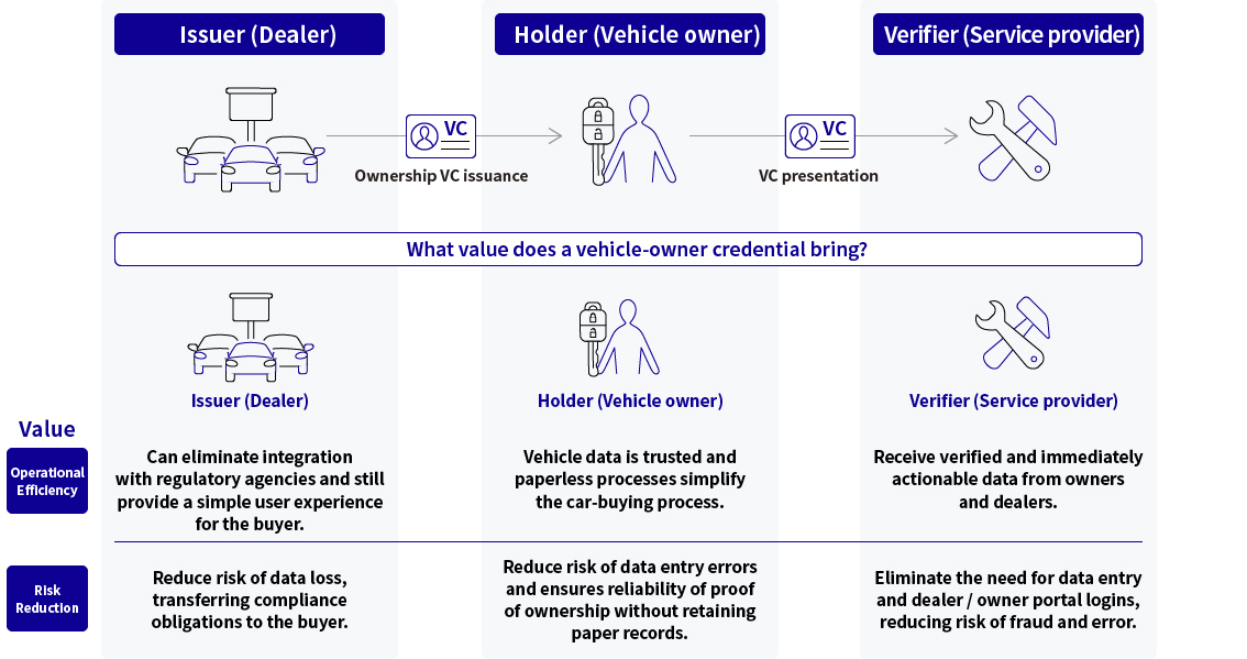 VCs can be issued not only to people but also to objects. For example, issuing VCs to cars can enable automatic verification of records such as inspection, accident, and repair, while preventing data tampering.