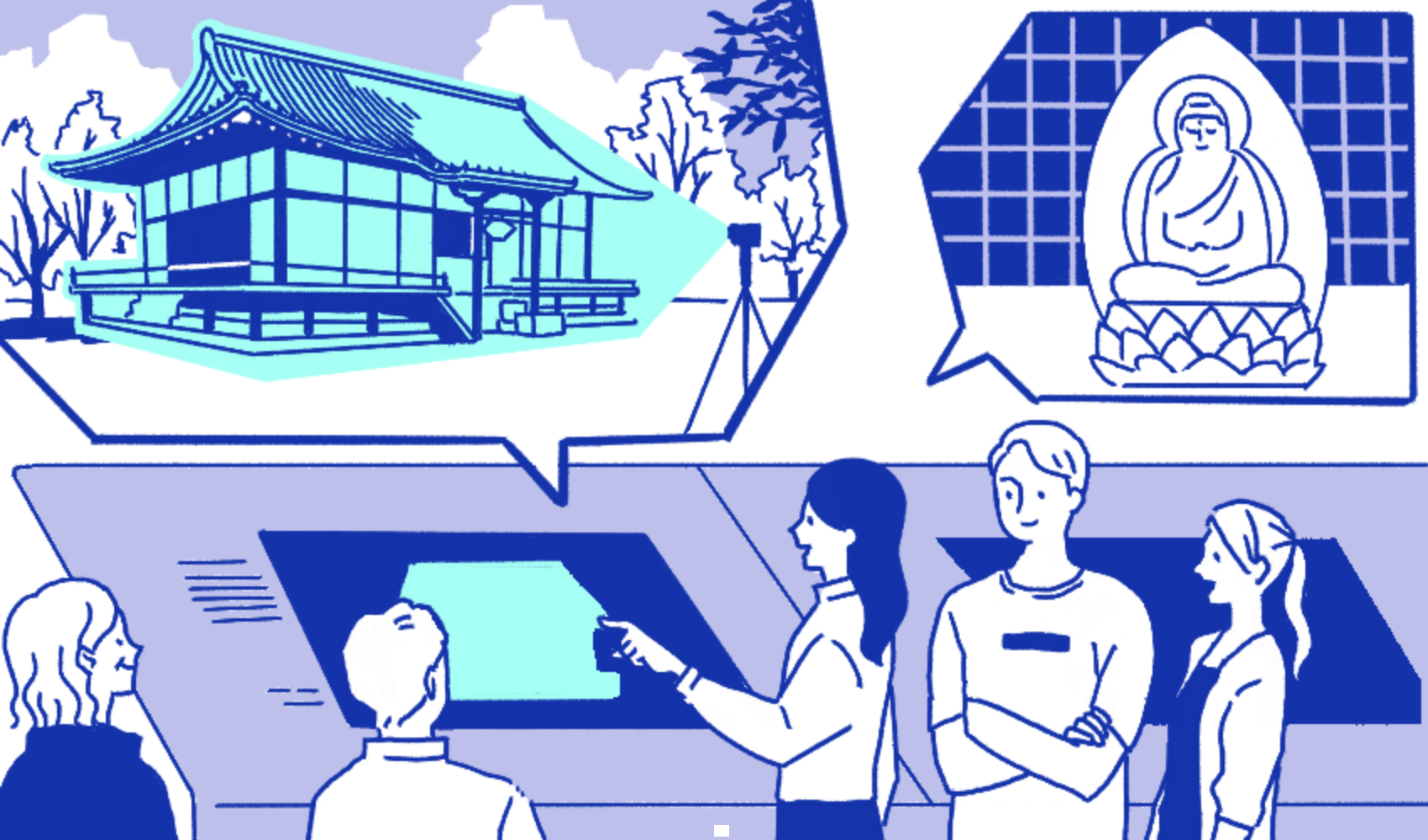 Illustration showing the appreciation of 3D digitalized data of historical buildings and artworks, achieved through high-precision photography.