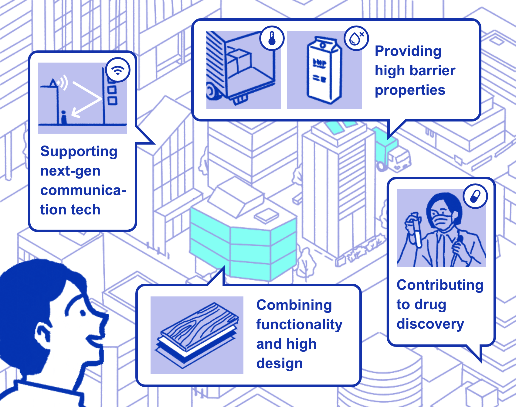 DNP's technology, derived from the printing process, is integrated into various aspects of daily life. Beyond design, DNP's technologies offer diverse functions, including varied barrier properties in packaging materials, scratch resistance, and weather resistance in products for living spaces like walls and floors. Additionally, they contribute to improved access to 5G radio waves in the telecommunications sector. In the life science field, these technologies are instrumental in enhancing the efficiency of drug discovery.