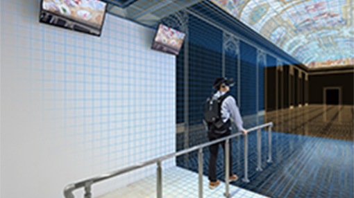 One of the interactive content system which DNP offers is an immersive VR system that allows users wearing head-mounted displays to navigate a virtual space by actually moving while following handrails. By creating a slightly altered visual reality, the system virtually augments the physical space, allowing visitors to feel as if they are moving through a vast virtual area, even though the actual exhibition room is much smaller.