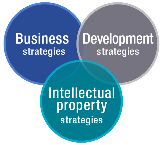 Image of integrating three strategies which are business strategy, development strategy, and intellectual property strategy.