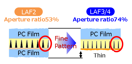 DNP's state-of-the-art optical design, mold cutting, and microfabrication technologies have improved brightness by achieving finer lines and finer pitches than conventional products.