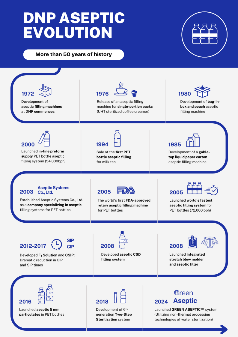 DNP launched a new aseptic filling system for PET bottles with a Two-Step Sterilization system that combines preform and bottle decontamination. This has successfully reduced the footprint and TCO of aseptic filling systems. The Two-Step Sterilization process is one of the most sterile and reliable aseptic filling systems in the world.