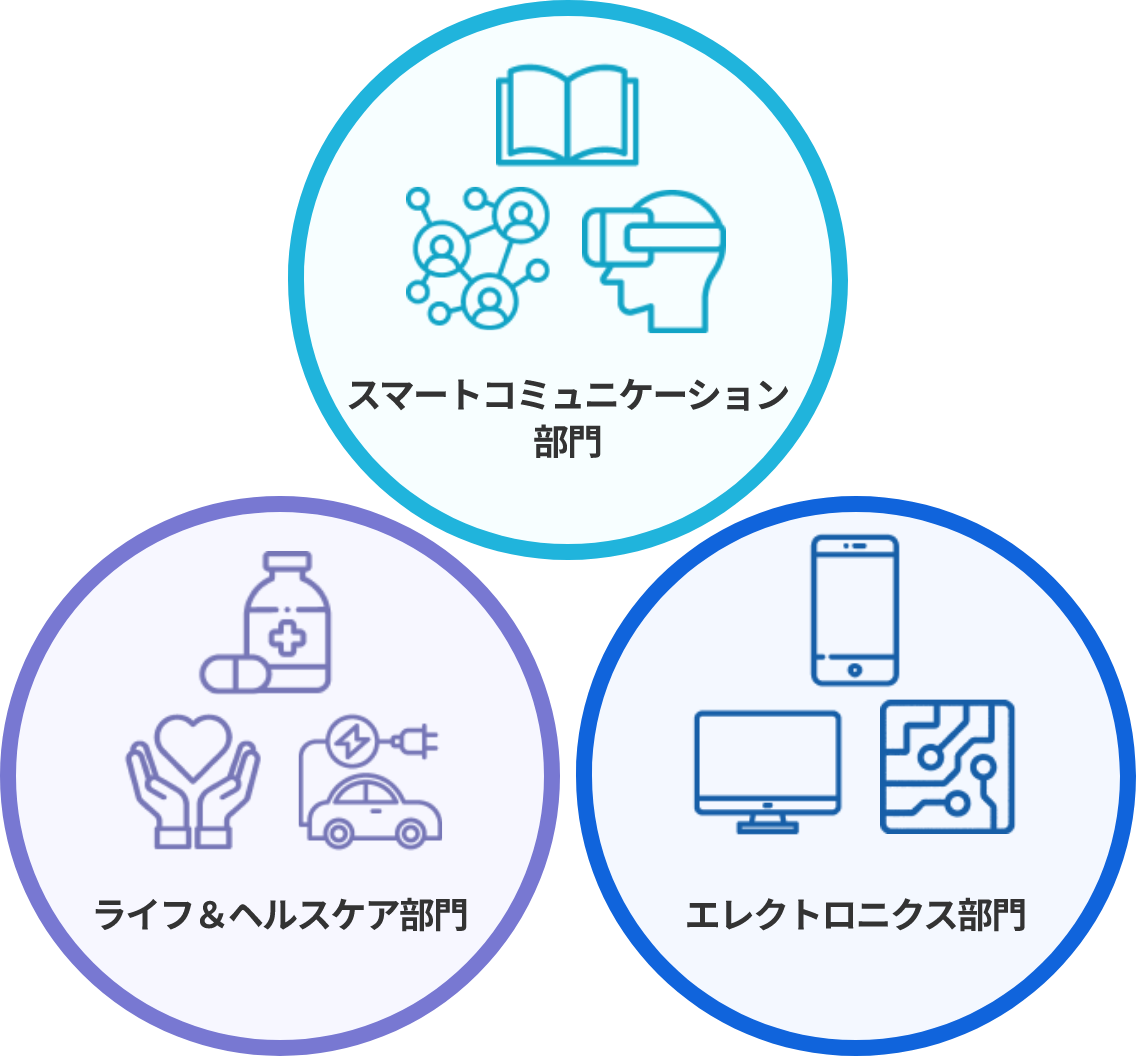 スマートコミュニケーション部門、ライフ&ヘルスケア部門、エレクロト二クス部門