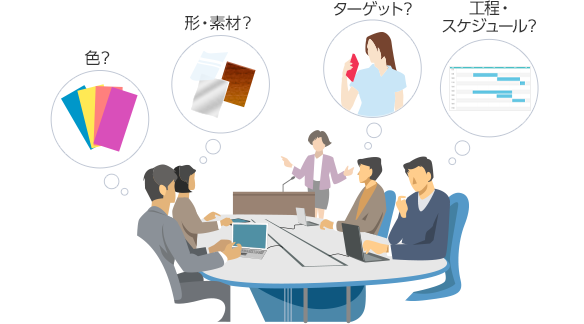 掲載内容やターゲットに応じて、色数や版形、紙の種類や厚さ、印刷方式や使用する生産ラインの選定、納品までのスケジュールやコストなどを算出します。最も効率的で効果的な方法を提案し、入稿する原稿や素材を整えます。