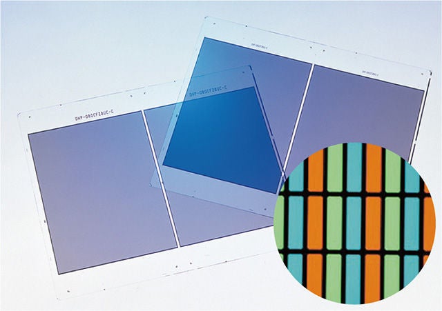 樹脂合成技術、フォトリソ技術を生かした低温プロセスで、カラーフィルター形成を可能にしました。