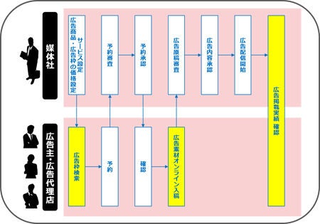 スマートフォン、カーナビ、デジタルサイネージ等に広告を配信する際の管理業務を効率化する機能を揃えており、広告主は管理画面を通じて「広告枠の検索・予約」「広告素材のオンライン入稿」「広告掲載実績の閲覧・確認」を行うことができます。広告配信の管理業務を効率化できると共に、特定のエリアのみへの配信など、より効果的な広告配信を行うことが可能です。また、媒体社は本システムを導入することで、広告主との広告枠の取引や広告内容の確認、配信実績の提供などをオンラインで行うことができ、運用負荷や人件費などの軽減が図れます。