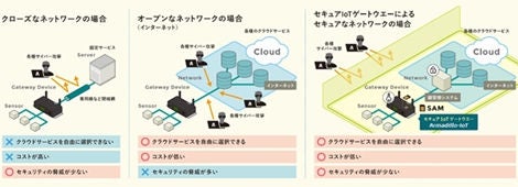 こうした課題に対して、インターネットを利用することで運用コストを抑えながら、セキュリティが保たれたIoT環境を実現するため、DNP、コネクシオ、アットマークテクノは、各種センサーなどが取得したデータや機器が生成するログなどのデータを安全にクラウドサービスに送信するIoT用のゲートウエー端末を開発しました。