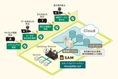 このゲートウエー端末は、アットマークテクノの産業機器向け組み込みプラットフォーム※2「Armadillo(アルマジロ)」をベースに、アットマークテクノとコネクシオが共同開発したIoTゲートウエー端末に、DNPがICカード事業で培ったデジタルセキュリティ技術を応用して開発したSAMを搭載しています。
