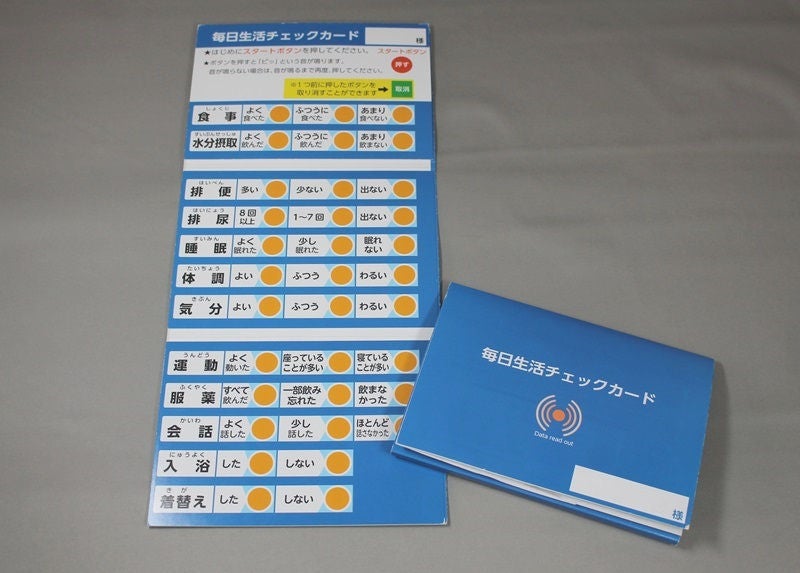 ○実験内容 :食事をしたか、水分は摂ったか、睡眠は十分かなどの12項目について、1日1回生活記録カードのボタンを患者が押します。