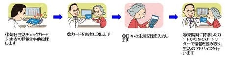 本システムは、電子モジュールを内蔵した毎日生活チェックカード、その記録を読み取るNFCカードリーダー、専用の管理ソフトで構成されています。毎日生活チェックカードでは、食事をしたか、水分は摂ったか、睡眠は十分かといった設問に対し、カード上のボタンを押すことで、患者一人ひとりの生活習慣などの状況が時刻とともに記録されます。このカードをNFCカードリーダーにかざすことで、管理ソフトを介して患者ごとの情報を閲覧することができます。