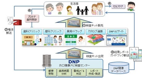 - 生活者は「DNPお口健康ナビ」の検査キットをカタログ通販サイトや薬局・ドラッグストア、医療機関などで購入します。