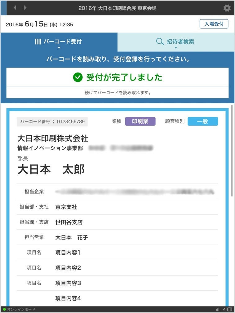・ 入場受付から商談時のメモ、アンケート機能などを装備したタブレット端末を使用して、イベント会場の場で細かい顧客情報を取得できます。(商談メモ、アンケート機能はオプション)。
