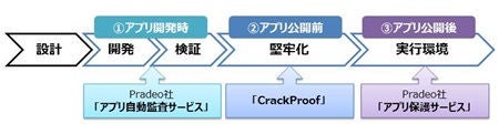 今回DNPは、アプリの開発段階から公開後まで、ワンストップでその情報セキュリティ機能を高めるサービスを提供します。サービスを導入した企業は、アプリの開発段階ではプラデオが提供する「アプリ自動監査サービス」で未知の脅威からの攻撃を防ぐ振る舞い検査を行い、開発したアプリの実行ファイルに対してはDNPの「CrackProof」で処理を行うことで改ざんを防止することができます。また、アプリ公開後は、プラデオの「アプリ保護サービス」で、同じスマートフォンにダウンロードされている他アプリの危険度を検知します。これら3段階の多層的なセキュリティ対策を行うことによって、今まで以上にセキュリティを高めることができ、企業および利用する生活者双方にメリットを提供します。