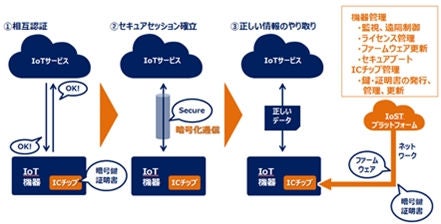 DNPのIoSTプラットフォームは、このセキュアICチップをIoT機器へ組み込むことで、機器とサービスの間の相互認証および通信データの暗号化、機器が取得・生成するデータの正当性の確認などを行います。同時に機器が取得・生成するデータや、機器に搭載されているソフトウエアの盗聴・窃取・改ざんを防止します。