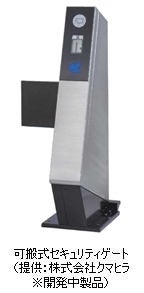 クマヒラは、運搬可能な「可搬式セキュリティゲート」の提供を検討しています。従来の専用回線を使用する据え置き式のセキュリティゲートに対して、可搬式セキュリティゲートはモバイル回線や無線LANなどのオープンなネットワーク環境での利用が想定されるため、今回、セキュアICチップを組み込むことでセキュリティ機能の向上を目指します。サテライトオフィスのほか、短期間に実施されるイベントやコンサート会場などでも利用可能で、省人化にも貢献します。