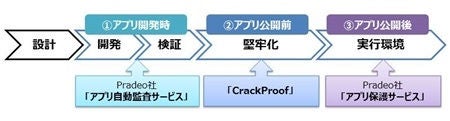 アプリの開発段階から公開後まで、ワンストップで情報セキュリティ機能を高めるサービスで、アプリの改ざんや解析を阻止し、クラッキングの被害からアプリを守る“堅牢化”ソフトウエア「CrackProof」 と、アプリ開発段階で不正コードの混入の有無などのアプリの監査を行うアプリ自動監査サービス、更に、アプリの実行段階において他のアプリの危険度をチェックし、起動停止やアンインストールを選択できるようにするアプリ保護サービスで構成されています。
