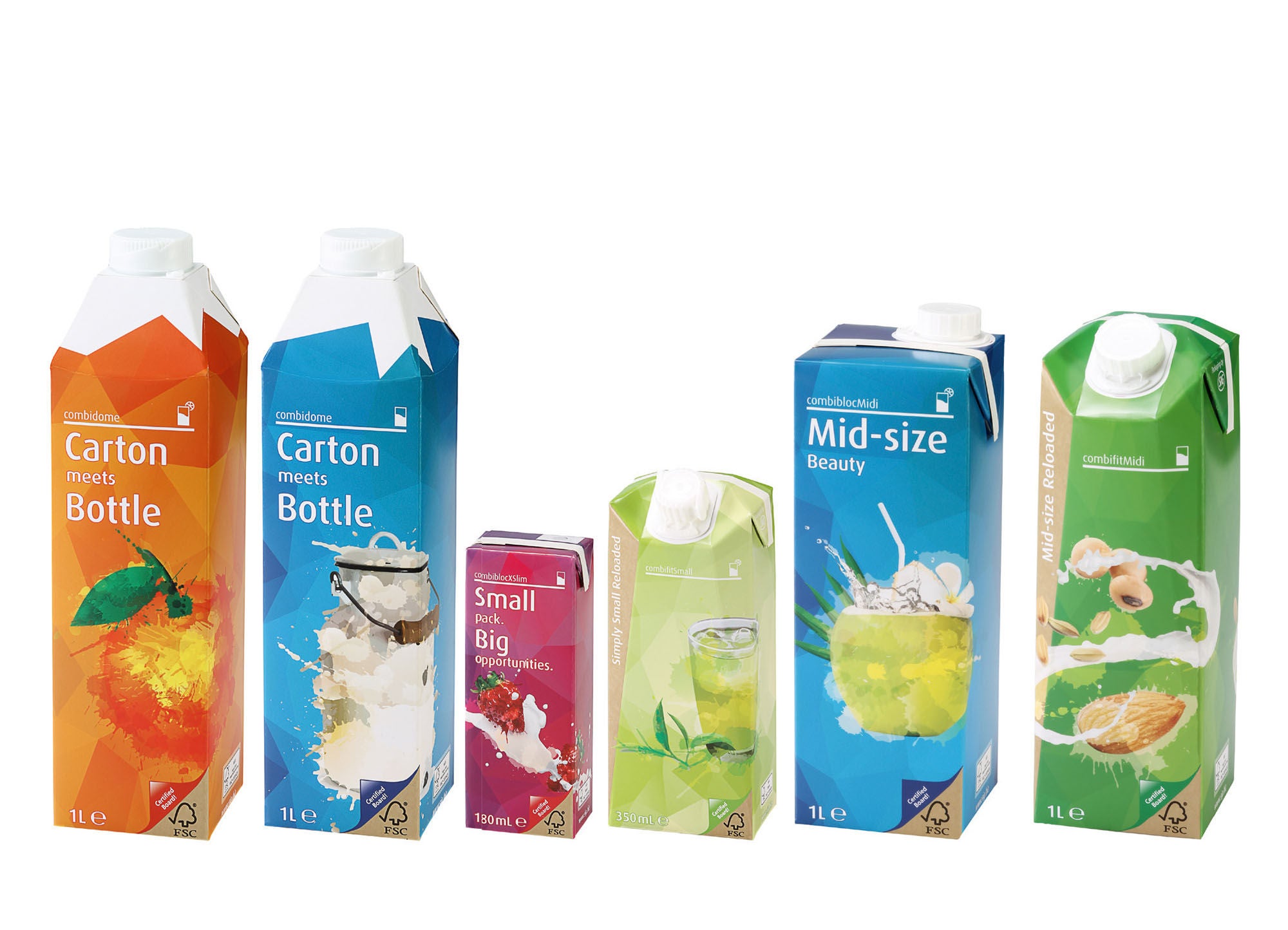 SIG社が開発した再開封可能な口栓付きの紙容器である「combidome(コンビドーム)」や「combifit(コンビフィット)」など、形態・容量・開封方法などが異なり、形状に特長のある約100品種の製品を提供します。
