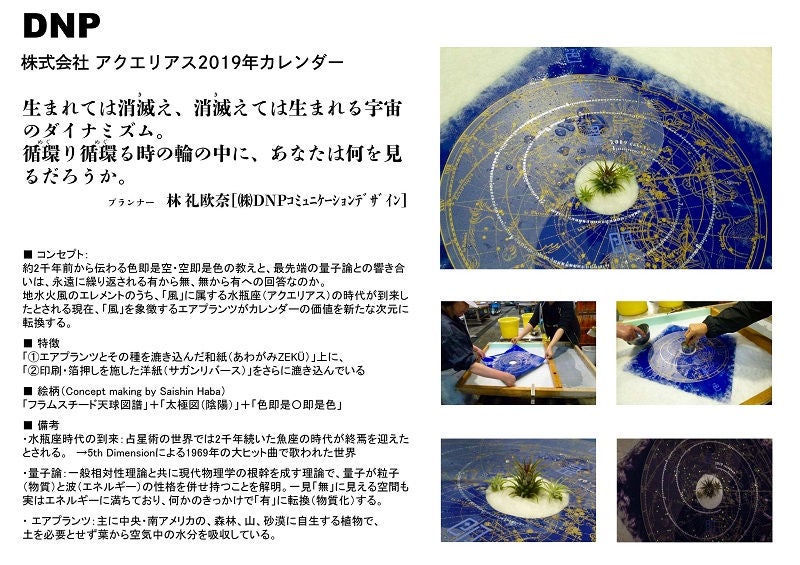 今回DNPコミュニケーションデザインが受賞した「株式会社アクエリアス2019年オリジナルカレンダー」の最大の特長は、生きた植物(エアプランツ)をそのまま和紙に漉き込んだことです。日々成長する植物を楽しむことができ、条件が整えば花を咲かせることもあります。