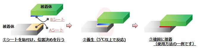 〇異なる成分をコーティングした2枚の粘着テープを貼り合せることで硬化反応を起こし、異素材の接着作業を行った後、室温で約1日置くことで、実用強度の接着力を発揮する製品です。
