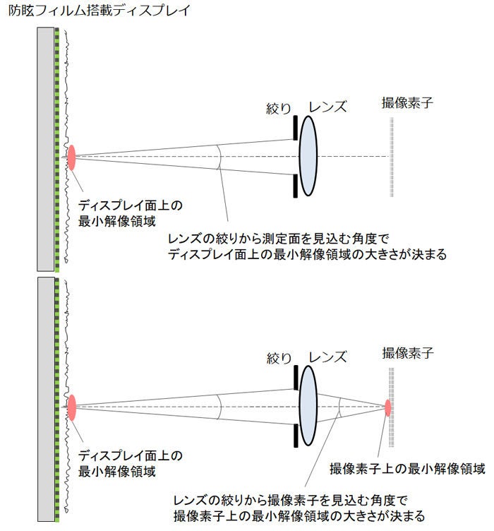 ぎらつき測定は、防眩フィルムを貼ったディスプレイ表面をカメラで撮影して、撮影画像からぎらつきの明暗として感じられる輝度分布の標準偏差を平均値で除して行います。DNPは、カメラレンズの絞りから測定面を見込む角度でディスプレイ面上の最小解像領域の大きさが決まることを確認し、ディスプレイ面上の最小解像領域の大きさがぎらつきに反比例することを突き止めました。