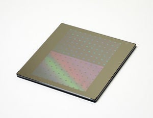 EUVリソグラフィ向け5nmプロセスに相当する高精度なフォトマスク(左)、パターン拡大写真(右)
