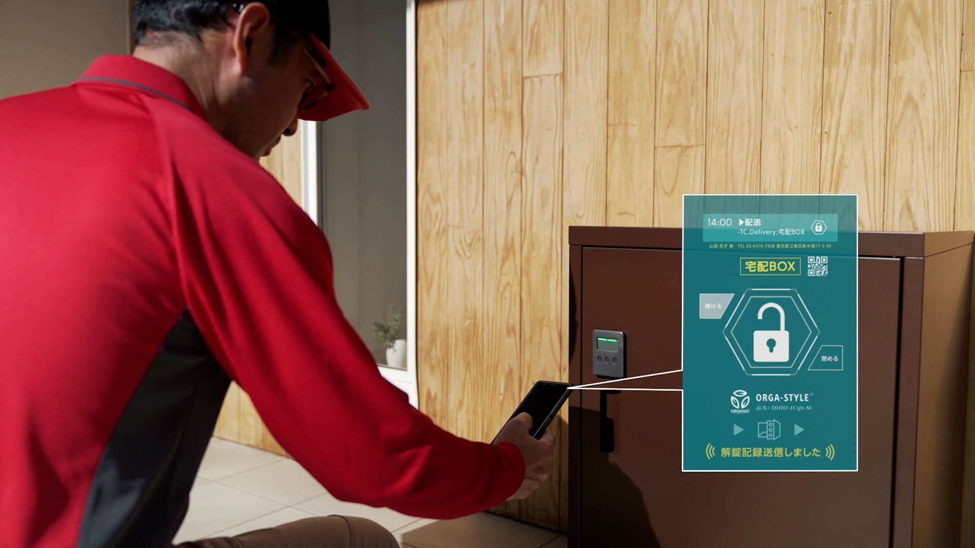 シェアリングカーでのドアの施錠・解錠シーン(写真左)、物流業者の「置き配」ボックスへの宅配物の投函シーン(写真右)