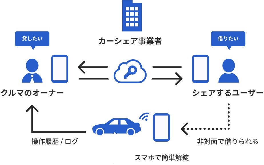 自動車のオーナーとユーザーが鍵の受け渡し日時を合わせることなく、非対面で鍵を受け渡すことができます。対面での物理的な鍵の受け渡しを解消し、スムーズかつ安心なカーシェアを実現します。
