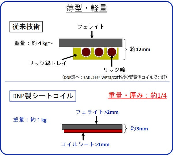 - 電動車向けのフェライトを含めたコイルの厚さは約3mm、重量は約1kg(SAE Internationalが規定するJ2954 WPT3/Z2対応のコイルの場合)です。リッツ線を用いた同仕様の既存製品の厚さ約12mm、重量約4kg以上と比べて、厚さ・重量ともに約4分の1と、大幅な薄型化・軽量化を実現しました(DNP調べ)。