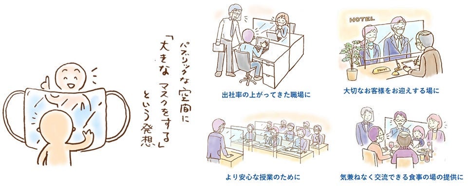 安心・安全な社会を維持していくためには、今後も引き続き感染防止対策を実施していくことが求められると予想されます。そうした対策を継続していく際には、フェイスtoフェイスでの会話が必要であったり、対話が重要視される場面においては、各自のマスク着用に加え、「空間にもマスク」をすることで、コミュニケーションの快適さを維持するツールが必要です。 また、感染収束傾向が見られた際にも、ストレスを感じさせない「空間のマスク」を設置しておくことで、感染防止対策を変更することなく、誰もが安心・快適なコミュニケーションができる空間を維持することができます。
