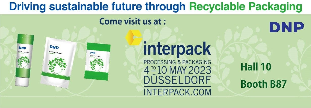 大日本印刷株式会社(DNP)グループのPT DNP Indonesiaは、2023年5月4日~10日にドイツ・デュッセルドルフで開催されるヨーロッパの国際的な加工・包装産業展「interpack 2023」に出展します。また、Dai Nippon Printing (Thailand) Co., Ltd.は、2023年6月14日~17日にタイ・バンコクで開催される東南アジアの「ProPak Asia 2023」に出展し、リサイクルしやすいモノマテリアル包材など、環境に配慮した高機能フィルムの新製品を展示します。