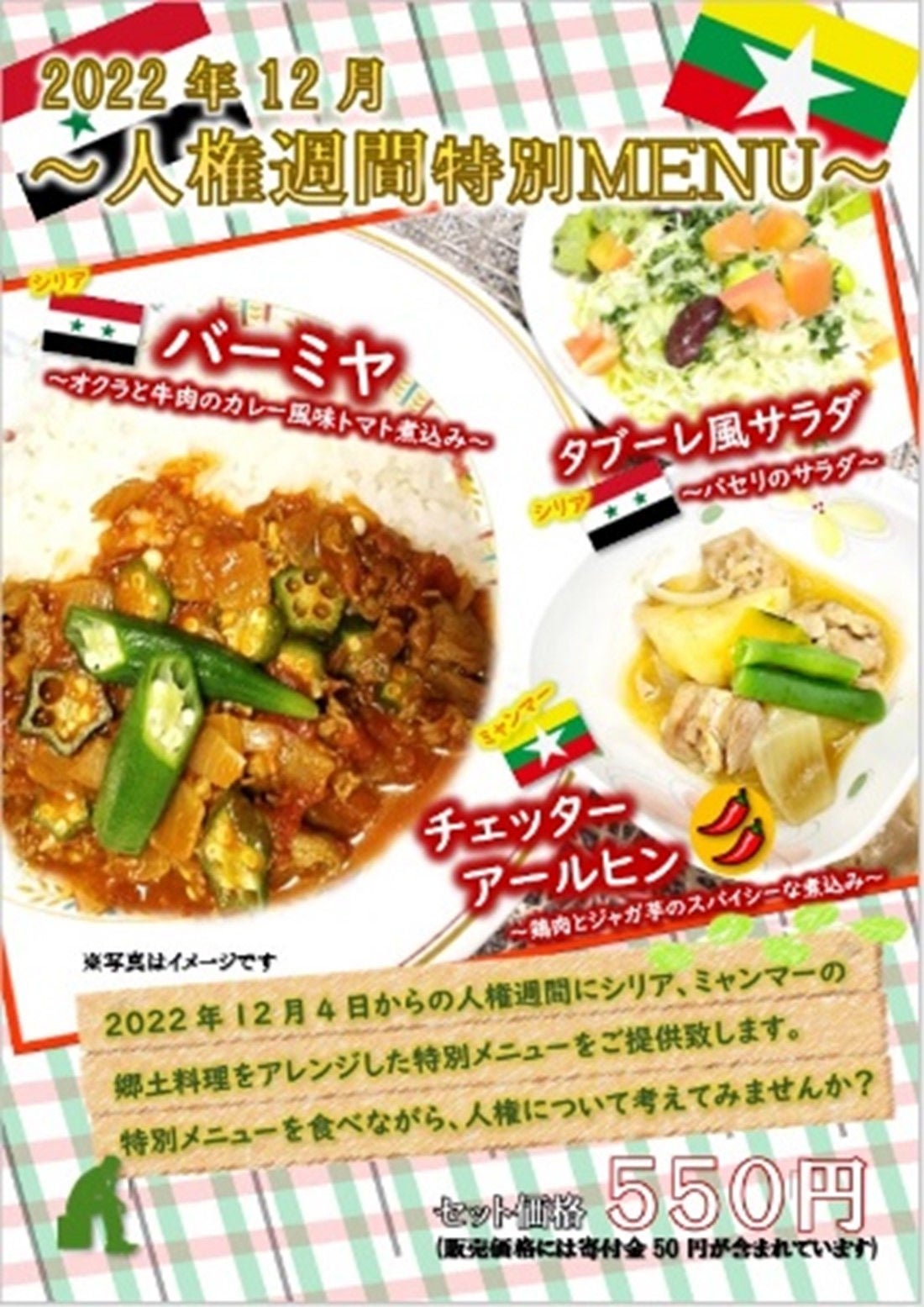 国連「世界難民の日」(左)と「人権週間」(右)に社員食堂で提供した支援メニューのポスター