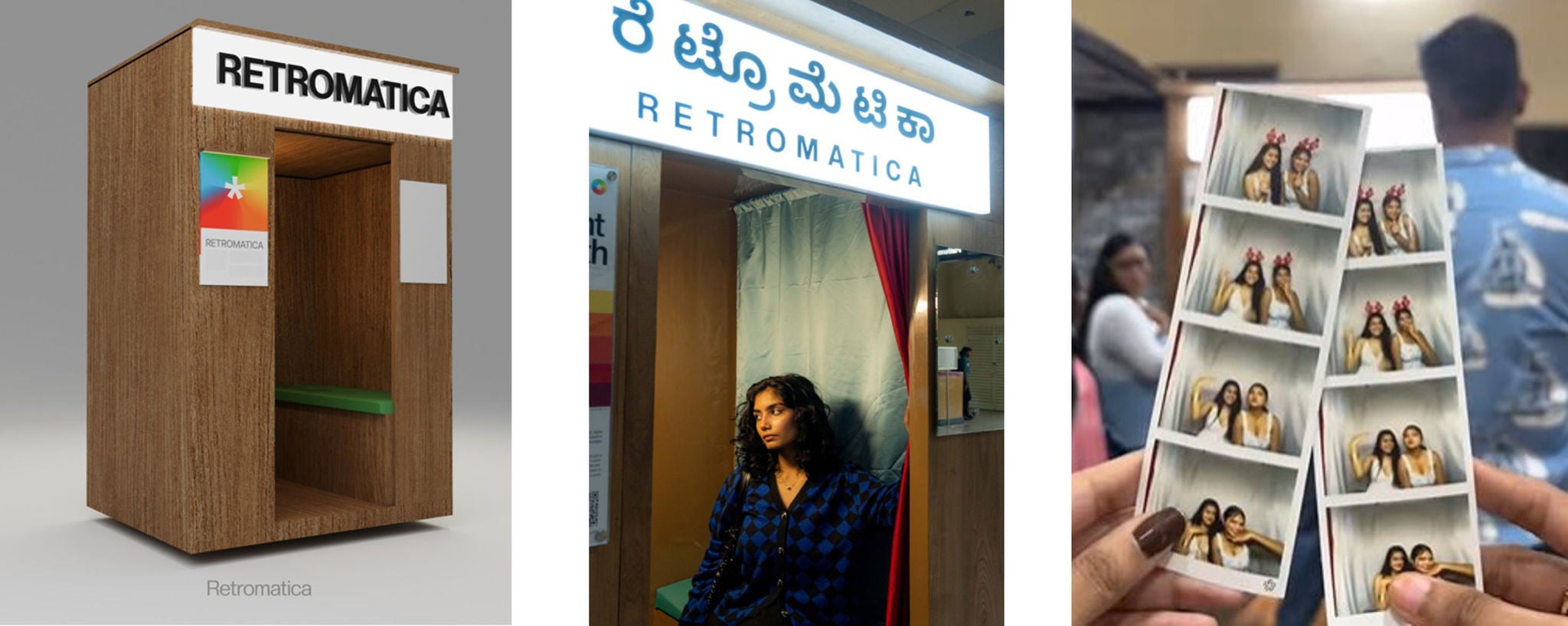 フォトブース内に個人またはグループで入り、別々のカットを撮影します。横2×縦6インチの縦長のシート2枚に、レトロ風な写真がプリントされ、友人等とシェアできます。