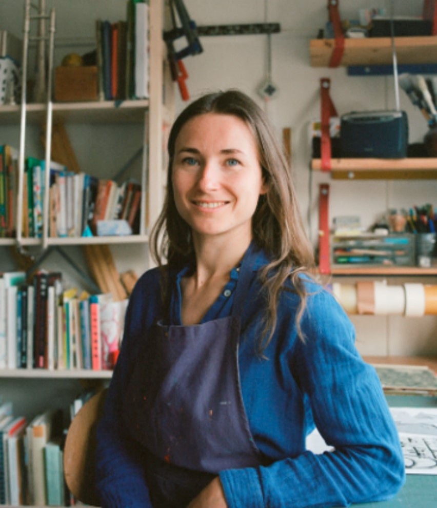 鮮やかな色づかいとシンプルな造形のバザン氏の作品は、彼女自身の手によるシルクスクリーンやステンシルなど、さまざまな印刷技法から生み出されています。近年は、子どもたちに印刷の楽しさを伝えることに力を入れ、みんなで一つの本や絵をつくるプリンティング・ワークショップを開催しています。フランス・パリ近郊のサン=ドニに在住し、制作を続けています。