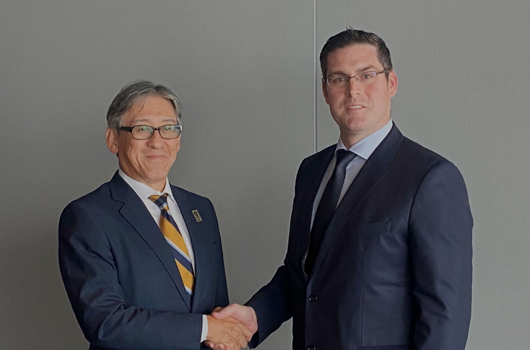 締結式の様子:DNP 常務執行役員 沼野芳樹(左)、Rubicon社 Lyle Laxton CEO(右)