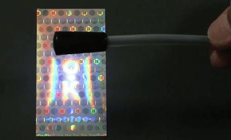 また、従来は特殊な器具が必要だった真贋判定を手軽に行えるように、使い勝手を高めた「LED判定ホログラム」を2016年に発売。ハンディタイプのLEDの光源やスマートフォンのライトをホログラムに当てると、正規品の場合は適切な文字や絵柄が浮かび上がります。このホログラムの真贋判定の状況をスマートフォンなどのカメラで撮影し、その写真データをメールで送ることで、遠隔地にいる関係者とも情報共有できます。