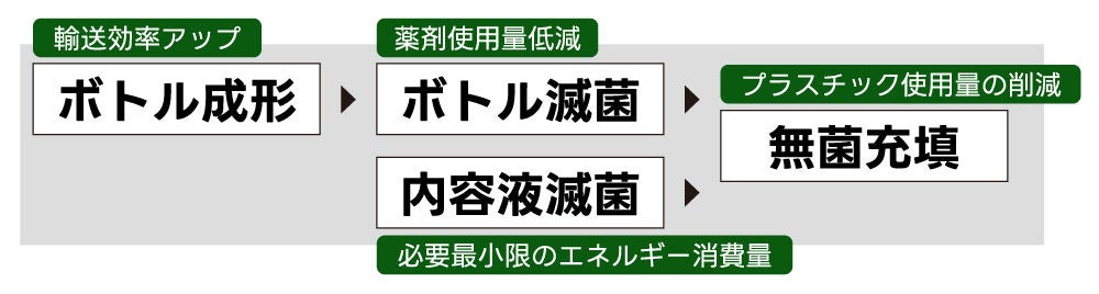 - 無菌充填:内容液を常温で充填することで容器の薄肉化が可能となり、プラスチック使用量を削減