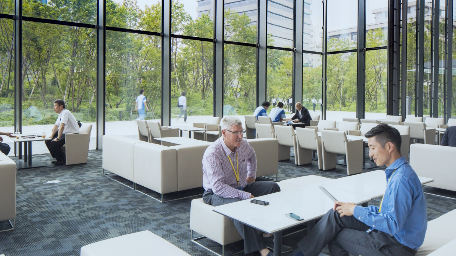 窓の外に市谷の杜が広がるDNP市谷加賀町ビルのロビー