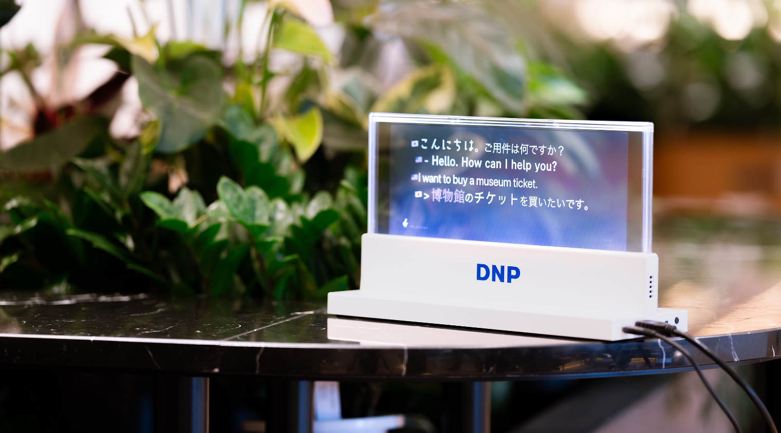 写真はDNP対話支援システム。高い邦訳精度と即時性のある字幕表示により言葉の壁を超えた窓口対応を実現。