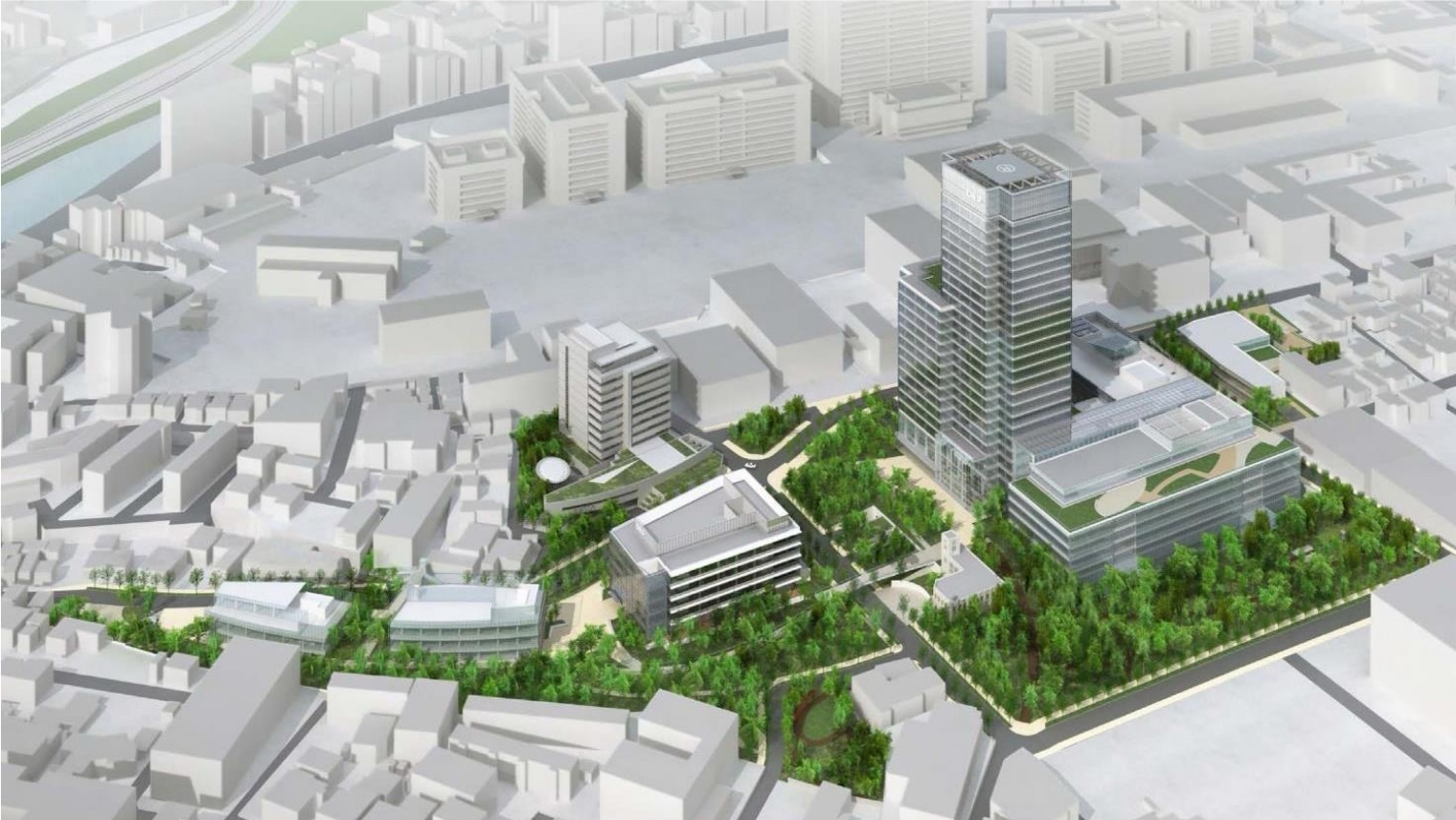 市谷地区再開発プロジェクトの基本計画図の段階から、敷地の大部分が豊かな緑に囲まれているのが見られます。