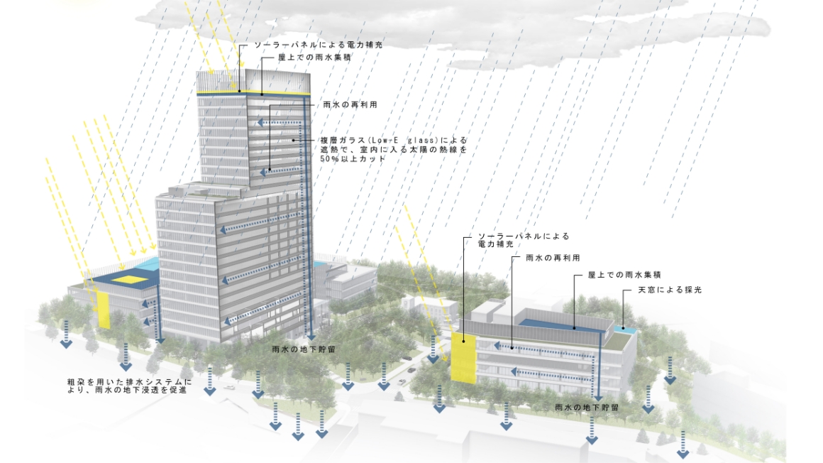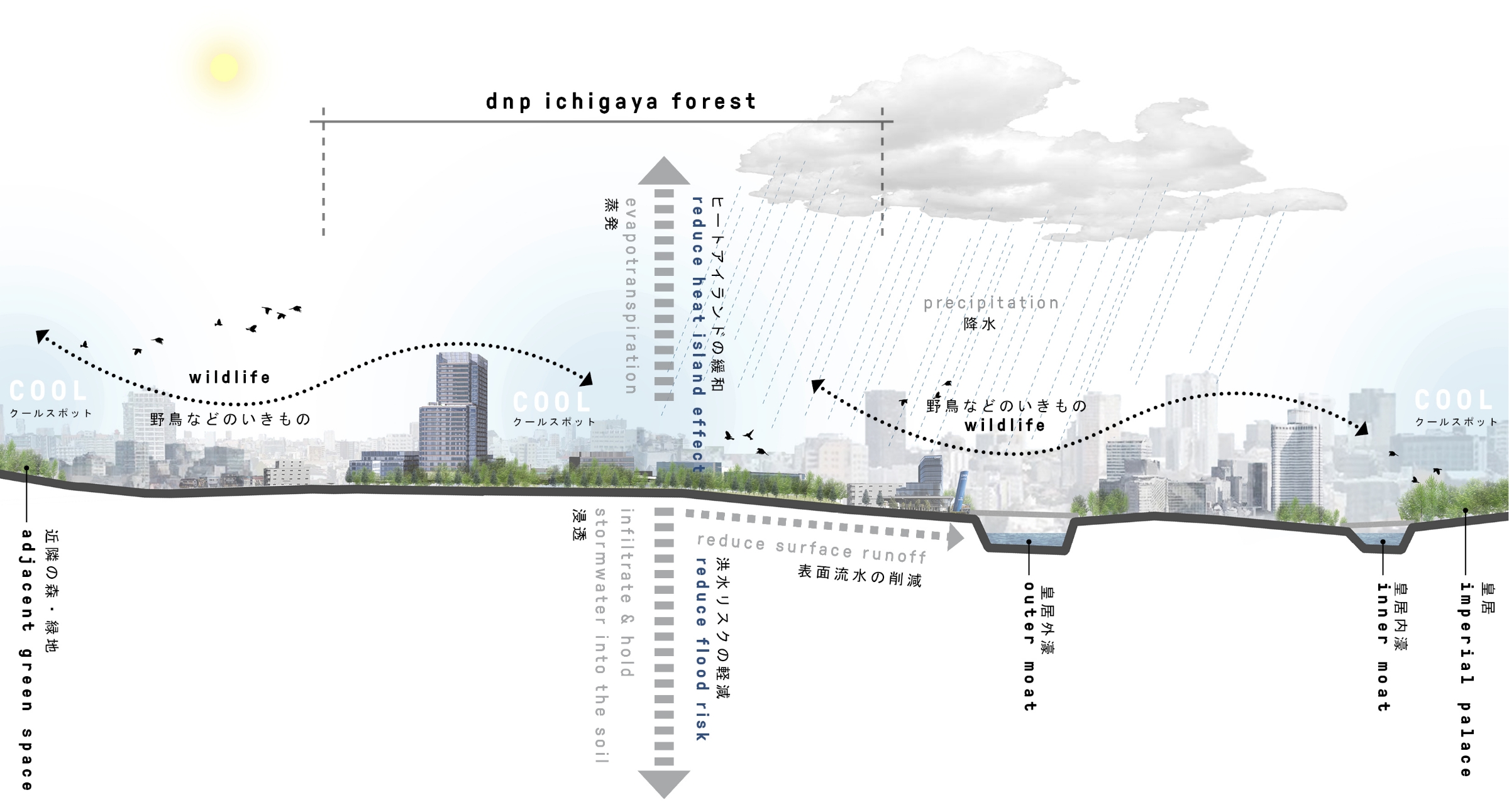 また「市谷の杜」は、二酸化炭素排出量の削減など環境と調和したシステムとしても役割を果たします。都市のクールスポットとしてヒートアイランド現象を緩和する、雨水の地下への浸透を促すことで洪水のリスクを抑制する、近隣の森や緑地とともに生物が生息・移動できるネットワークを都市に創出するなど、“緑のインフラ”となることをめざしています。