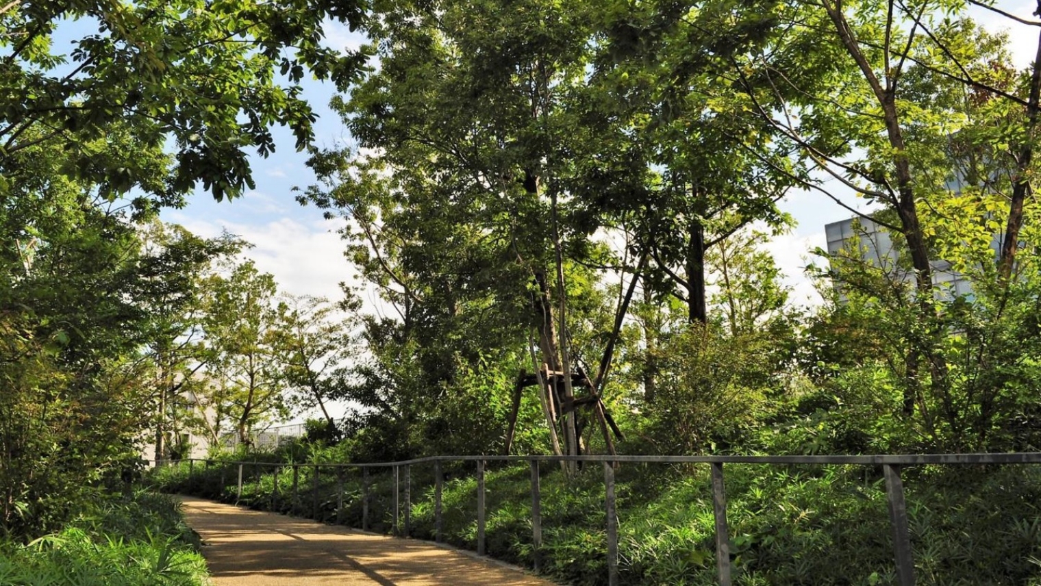 かつて長延寺谷と呼ばれたこの地は起伏が豊かで、「市谷の杜」では尾根や谷、斜面など地形ごとに適した植物を配置し、多様性にあふれた自然の森を再現。高木・低木・草本類による階層構造を形成し、高茎類・低茎類の草本類を混栽することで立体的な構造をなしています。企業敷地の緑化にとどまらない、新宿御苑や皇居など周辺の緑地帯とも調和した100年先まで見越した環境づくりに取り組んでいます。
