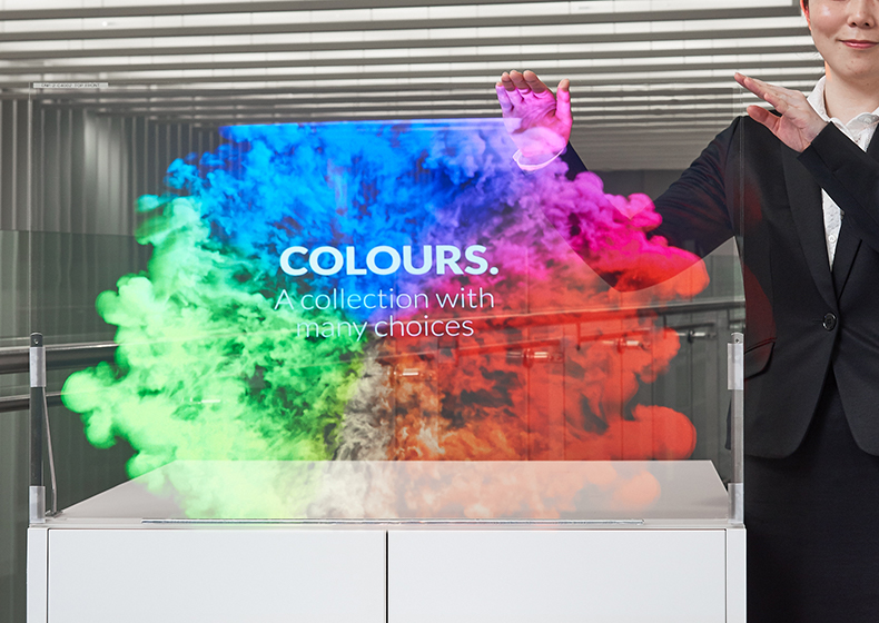 The transparent screen is starting to have an effect on people’s everyday life. Combining it with objects placed behind the screen can create special spatial presentations, while it is less visible when it is not in use. It has many advantages not seen in conventional screens.
