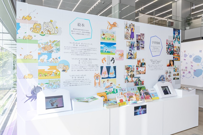 A display at a special exhibition at DNP Plaza (Ichigaya, Tokyo) showcasing picture books made into original manga-based anime |